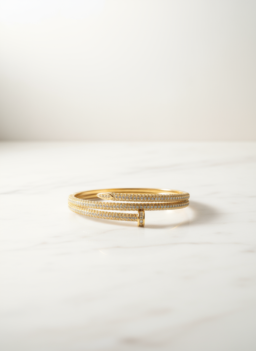 The Elegante Nail Design Bracelet in gold finish features a bold, modern twist on minimalist luxury. Inspired by iconic nail-shaped jewelry, it combines sleek lines with a polished look to elevate any outfit. Durable, lightweight, and stylish—perfect for both everyday wear and special occasions. A statement piece for contemporary fashion lovers.