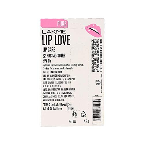 Lakme Lip Love Pure Lip Care keeps your lips moisturized for up to 22 hours with a creamy, nourishing formula. Infused with SPF 15, it protects against harmful sun rays while delivering a subtle tint. The balm glides on smoothly, leaving lips soft and supple. Ideal for daily use, it combines lip care with a pop of color. Enjoy hydration and protection in one swipe!