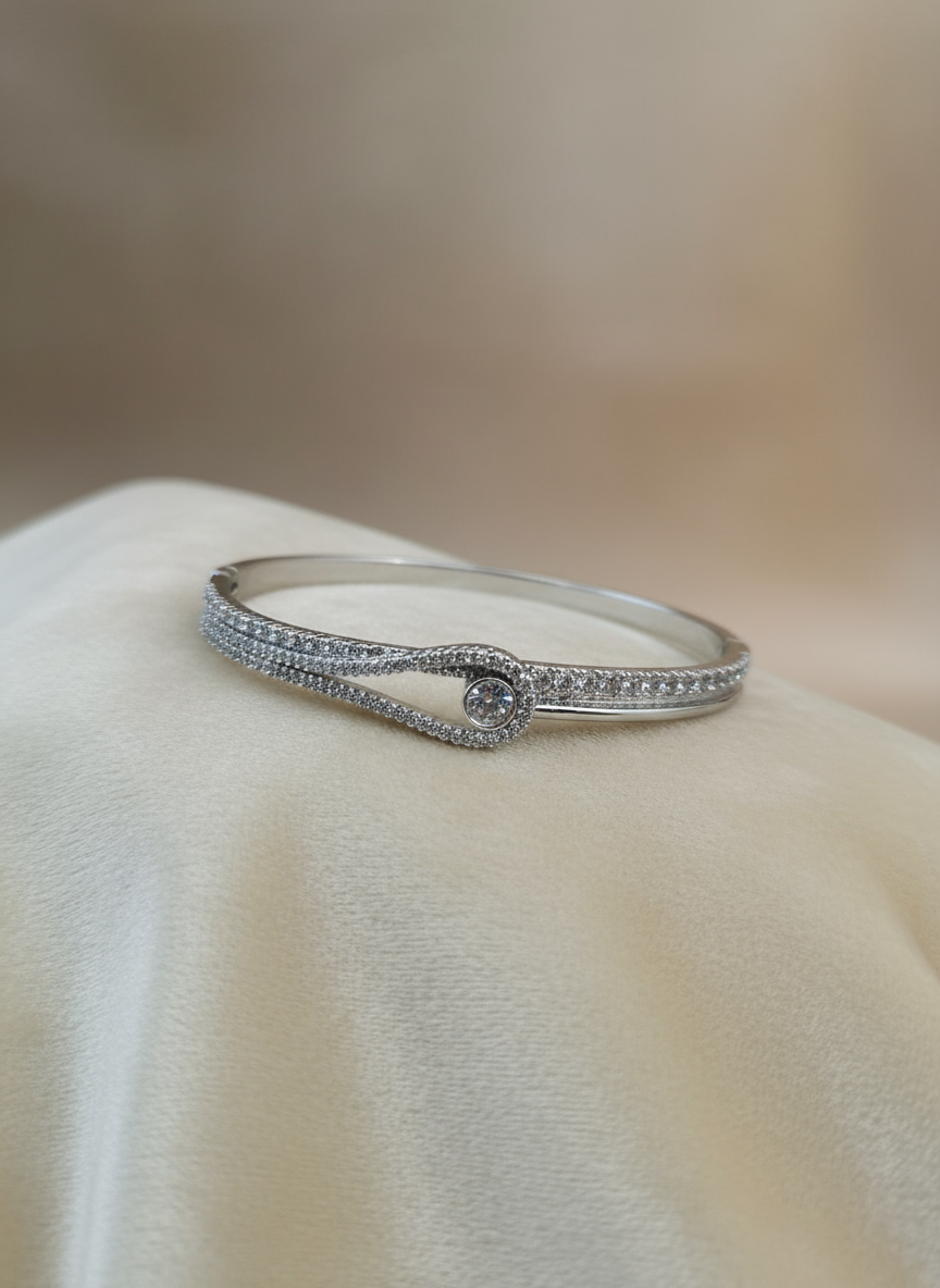 This Silver Knot Round Bracelet features an intricate knot design symbolizing unity and strength, crafted in a polished silver finish. Its sleek and classic style makes it a versatile accessory for everyday wear or special occasions. Lightweight and comfortable, it adds a subtle yet sophisticated touch to any outfit. Perfect for gifting or personal collection.